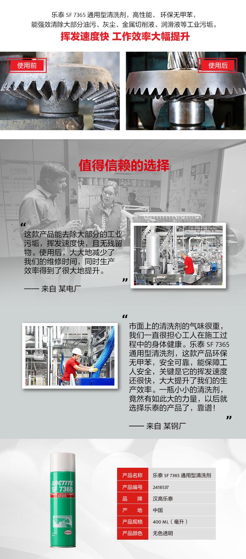 樂泰SF7365通用型清洗劑是一款高性能、環(huán)保無甲苯的零部件清洗劑。樂泰SF7365通用型清洗劑低氣味,使用更安全;樂泰SF7365通用型清洗劑揮發(fā)快,可節(jié)約工時、提升效率。對于油污、灰塵、金屬切削液、潤滑液等工業(yè)污垢,樂泰SF7365通用型清洗劑可實現(xiàn)無殘留強(qiáng)效清潔,適用范圍覆蓋電廠、礦場、石化、鋼鐵、紡織、水處理、造紙和食品加工行業(yè)。